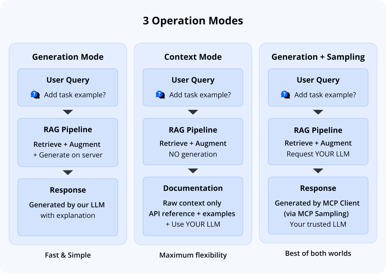 - Context mode: Retrieve verified, relevant documentation excerpts without generation, allowing you to use your own preferred LLM